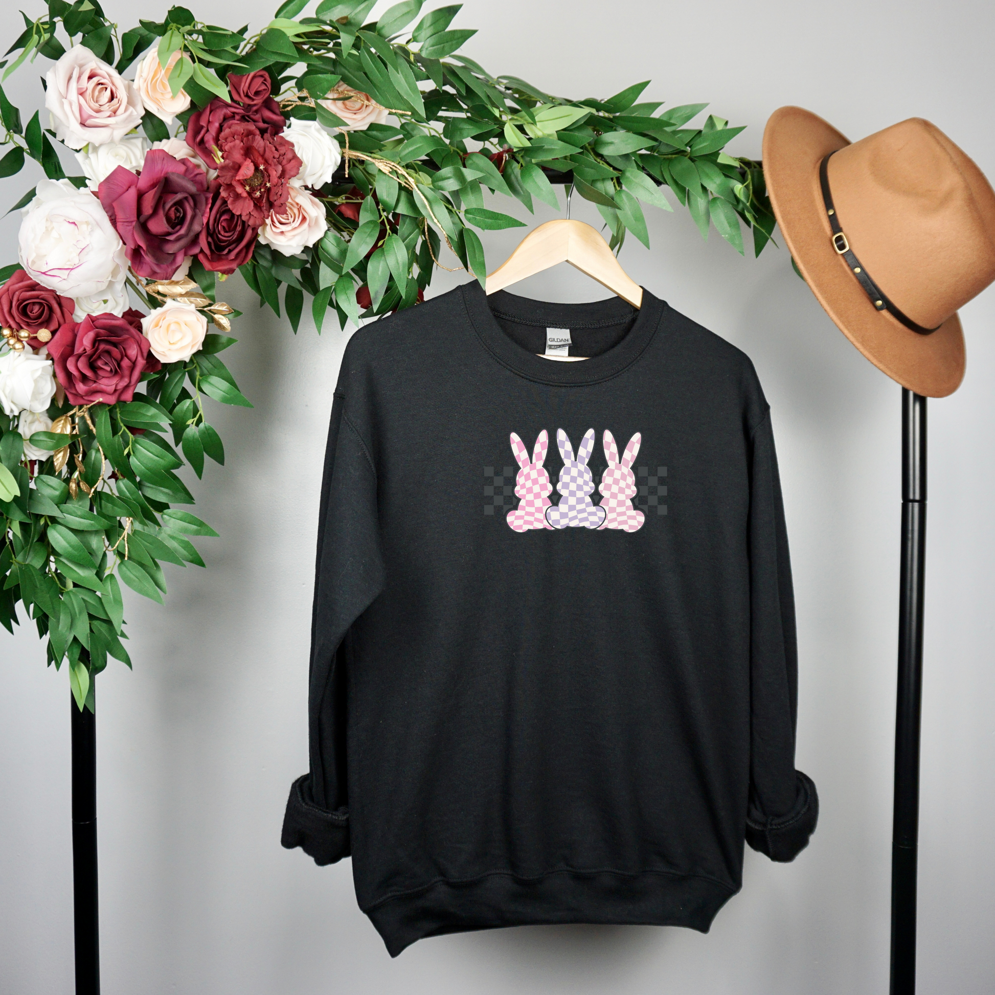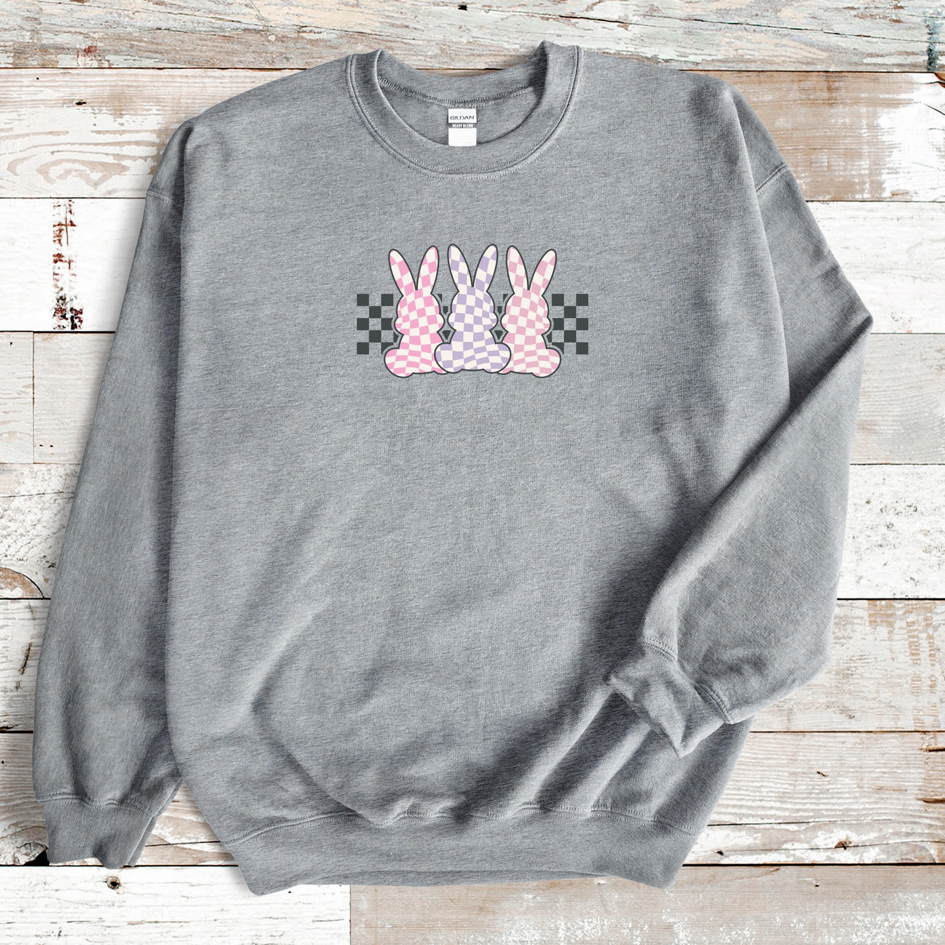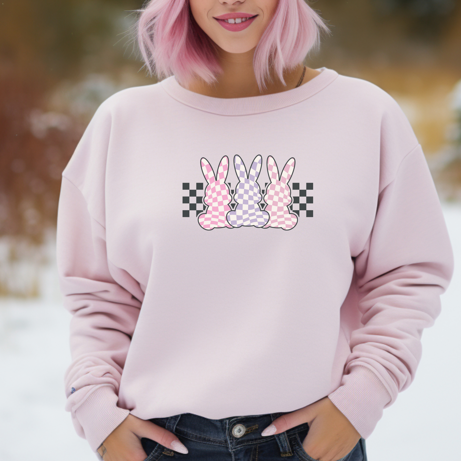 Introducing our enchanting Easter Bunny Trio Checkered Print Sweatshirt, a celebration of whimsy and charm that brings the joy of the holiday season to life in vibrant pinks and purples.